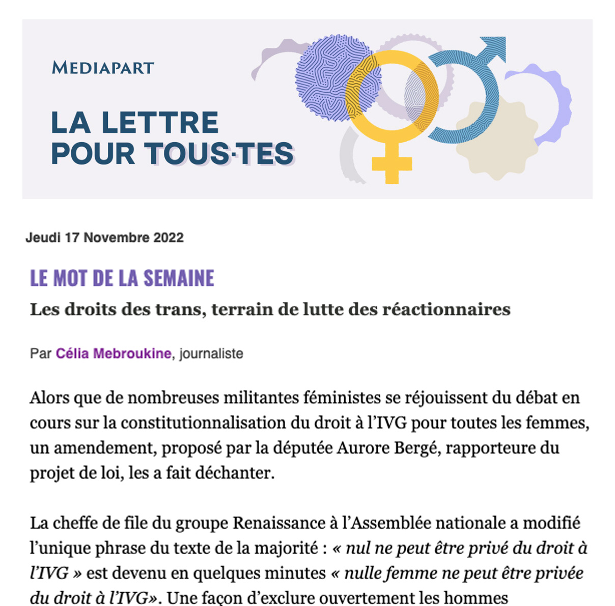 En France, et partout dans le monde, surgissent de nouveaux débats. L'actualité s'en trouve bouleversée. Des nouvelles générations se mobilisent. Un jeudi sur deux, retrouvez nos contenus consacrés aux violences sexistes et sexuelles, aux luttes féministes, aux mobilisations LGBTQ+, aux disputes sur le genre, et aux batailles pour l'égalité. Dans nos familles, au travail, nos intimités et dans la presse.